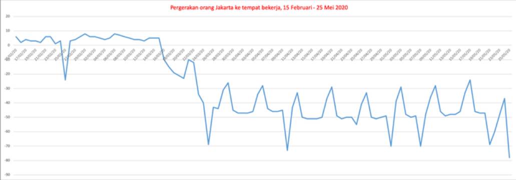 Laporan Mobilitas Google, 15 Februari-25 Mei, mengonfirmasi pada 23 Maret (dimulainya bekerja dari rumah sesuai perintah Gubernur), orang yang pergi ke kantor mulai turun hingga 23 persen. Pada 25 Maret malah menjadi berkurang 69 persen. Laporan Google ini diperoleh dari pemindaian perangkat telepon pintar yang dimiliki oleh warga Jakarta.